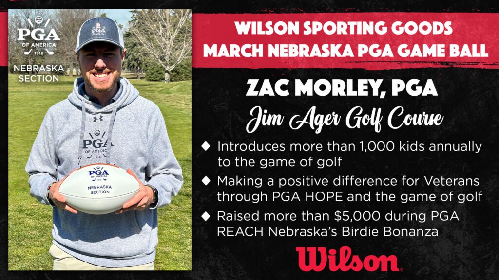 Lincoln, NE – The Nebraska Section PGA is proud to name Zac Morley, PGA, of Jim Ager Golf Course in Lincoln as the March Wilson Sporting Goods Game Ball recipient, recognizing his continued impact on growing the game and creating a welcoming environment for golfers of all ages and abilities.
