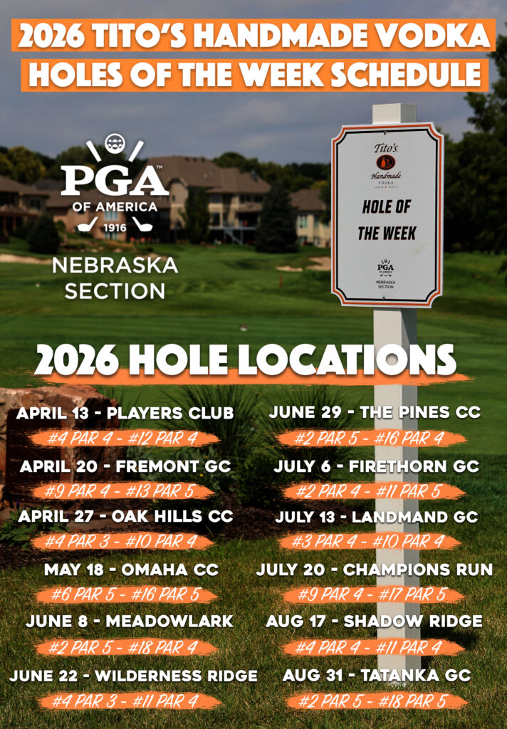 The Nebraska Section PGA partners with Southern Glazer’s Wine & Spirits to present the Tito’s Handmade Vodka ‘Holes of the Week’ (HOTW). Over the course of the season, two featured holes are chosen at designated Tito’s Handmade Vodka events. In 2025, 12 events on the schedule will featured Tito’s Handmade Vodka HOTW completing the 24-hole season-long challenge. Nebraska PGA Professionals must record scores on NINE of the designated holes to be eligible for prizes at the end of the season. Players will post their lowest scores relative to par for the 24 designated holes and each of their NINE best scores will count to their overall total.