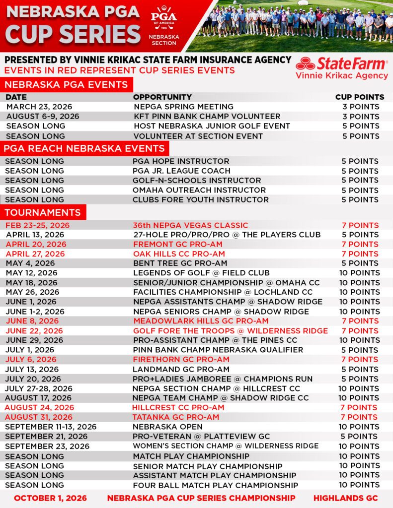The Nebraska PGA Cup Series promotes the involvement of Nebraska PGA Members and Associates in Section Activities. Those Members and Associates who participate in Section Tournaments, Section Meetings and other functions that benefit the growth and development of The PGA Professional will receive “Cup Points.” Points will be earned throughout the year to determine the most active Members and Associates in the selected activities. The top 28 Cup Points recipients will then be invited to play in the Nebraska PGA Cup Series Championship presented by Vinnie Krikac, State Farm Insurance Agency, on Thursday, October 1, 2026, at Highlands Golf Course in Lincoln, NE.